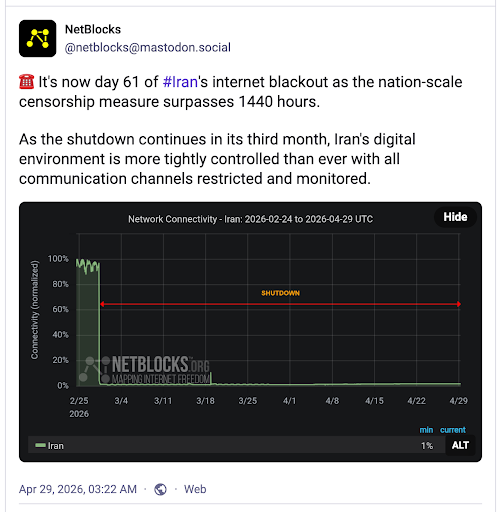 Against this backdrop, Iran emerges as a prominent example of decline in both internet and press freedoms. It serves as both a distinctive case marked by its own intricate challenges as a country and a microcosm of the global threats to press and internet freedom. As of April 29, 2026, Iran has been offline for 61 days: “the longest sustained nation-scale internet blackout … tracked in a highly connected society,” Going far beyond mere technical disruption, this is a collapse of the information environment, unfolding in the context of a war — though active hostilities have since temporarily eased — and violating the fundamental right to access the internet.