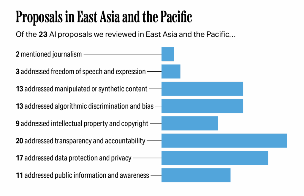 Of the 23 proposals we reviewed in East Asia and the Pacific, two specifically mentioned journalism; three addressed freedom of speech or expression; 13 addressed manipulated or synthetic content; 13 addressed algorithmic discrimination and bias; nine addressed intellectual property and copyright; 20 addressed transparency and accountability; 17 addressed data protection and privacy; and 11 addressed public information and awareness.