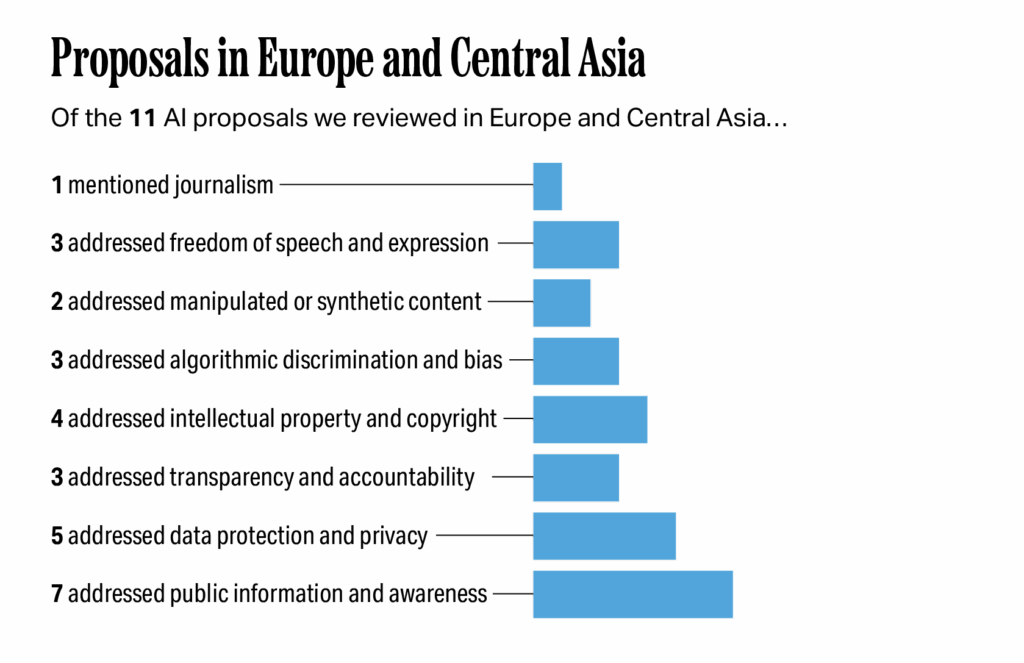 Of the 11 AI proposals we reviewed in the region, one specifically mentioned journalism; three addressed freedom of speech or expression; two addressed manipulated or synthetic content; three addressed algorithmic discrimination and bias; four addressed intellectual property and copyright; three addressed transparency and accountability; four addressed data protection and privacy; and seven addressed public information and awareness.
