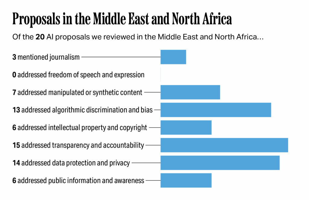 AI summary: AI proposals in the Middle East and North Africa do not mention freedom of speech or expression, reflecting the region’s overall low ranking in press freedom and the ongoing threats journalists face.