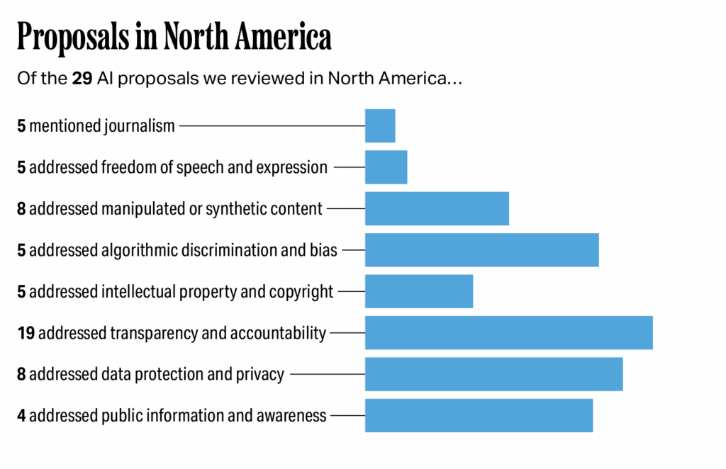 Of the 29 proposals we reviewed in North America, five specifically mentioned journalism; five addressed freedom of speech or expression; eight addressed manipulated or synthetic content; five addressed algorithmic discrimination and bias; five addressed intellectual property and copyright; 19 addressed transparency and accountability; eight addressed data protection and privacy; and four addressed public information and awareness.