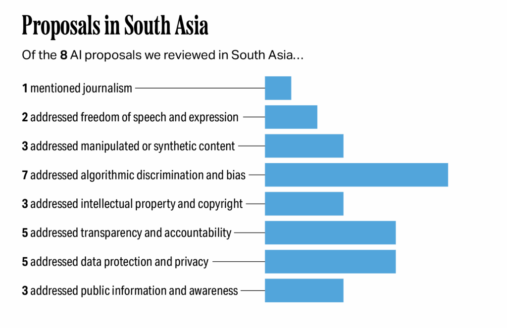 As in other regions, though, data protection laws can be misused to stifle public interest reporting. As such, policymakers should consider the impact their AI proposals can have on the news industry and consider exceptions within the laws to protect journalists’ ability to carry out investigations — as the Press Club of India and 21 media organizations have asked policymakers to do in response to India’s 2023 Digital Personal Data Protection Act. Though this law does not specifically address AI directly and, thus, was not part of our data set, it is worth highlighting since it is in the process of being operationalized and because of the significant press freedom concerns it has raised.