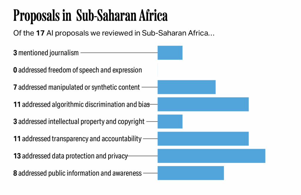 Of the 17 proposals we reviewed in sub-Saharan Africa, three specifically mentioned journalism; none addressed freedom of speech or expression; seven addressed manipulated or synthetic content; 11 addressed algorithmic discrimination and bias; three addressed intellectual property and copyright; 11 addressed transparency and bias; 13 addressed data protection and privacy; and eight addressed public information and awareness.